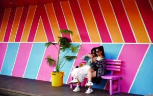 彩虹街入口處擺放著暴力熊、小太空人、英文路牌,街上設置了候車站、電話亭以及頗具設計感的斑馬線,可以輕松拍出歐美街頭風的照片。這里的一大特點是多種色彩的碰撞,以黃、藍、粉、紅為背景墻,放置著黃、粉等亮麗色彩的凳子,色彩鮮明,吸引著許多年輕人。